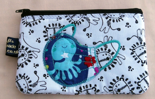 (Right) Fun lion outlines on a white background with appliqued mask design, featuring an octapus.