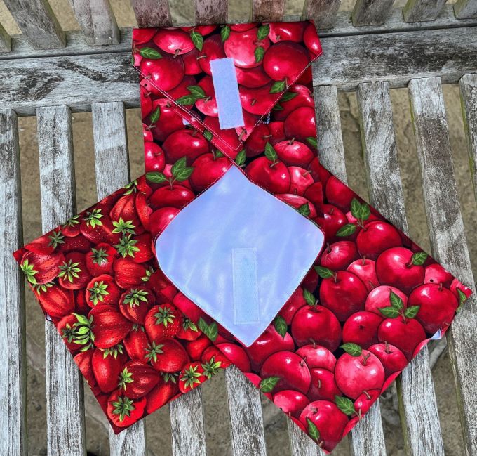 Three delicious looking sandwich wraps made from apple and strawberry design fabrics.